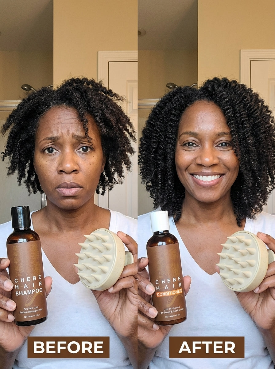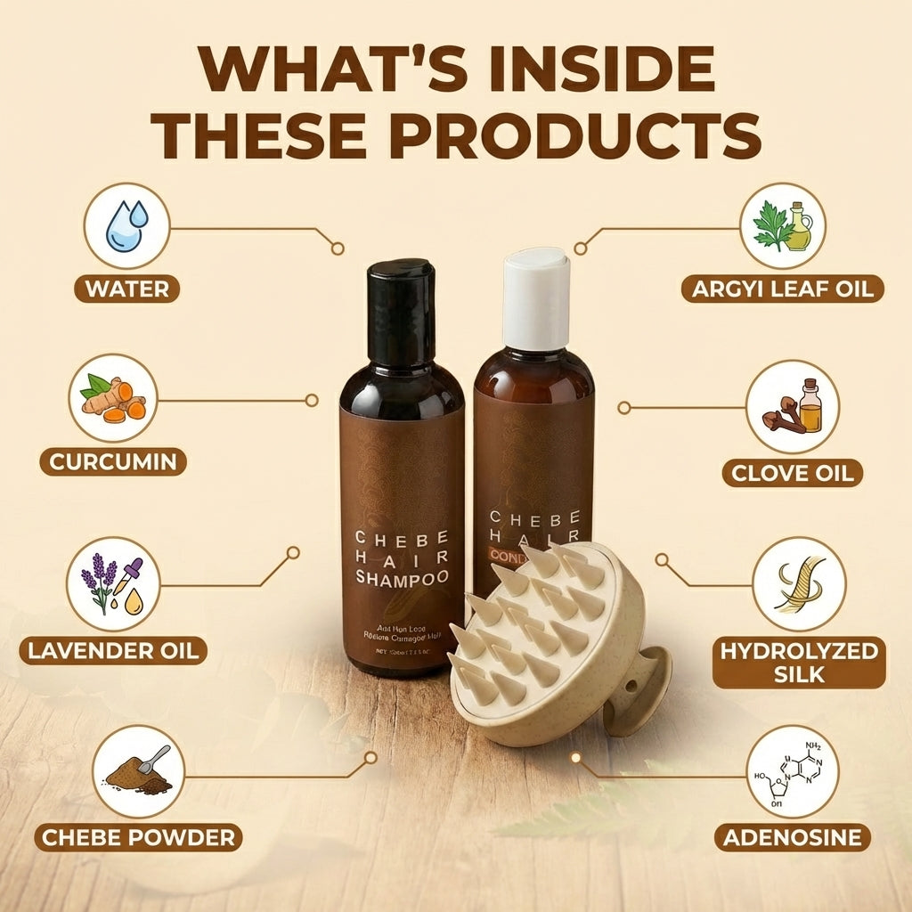 The Chebe Hair Shampoo gently removes buildup and impurities while preparing your scalp for nourishment. The Chebe Hair Conditioner restores moisture and strengthens each strand, helping reduce dryness and breakage.